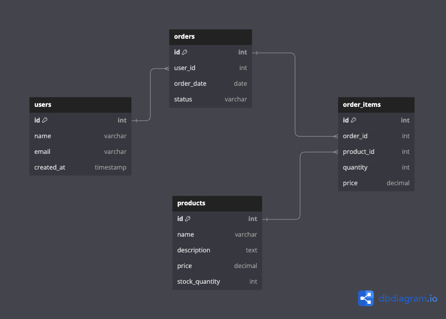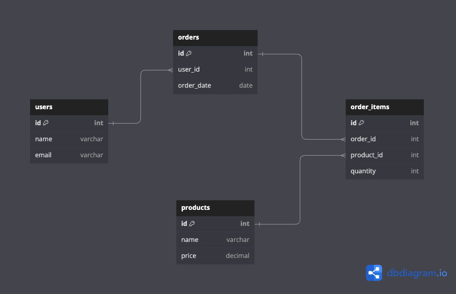 This ERD example shows the relationships between users, orders, products, and order_items tables, illustrating how they interact with each other in the database.